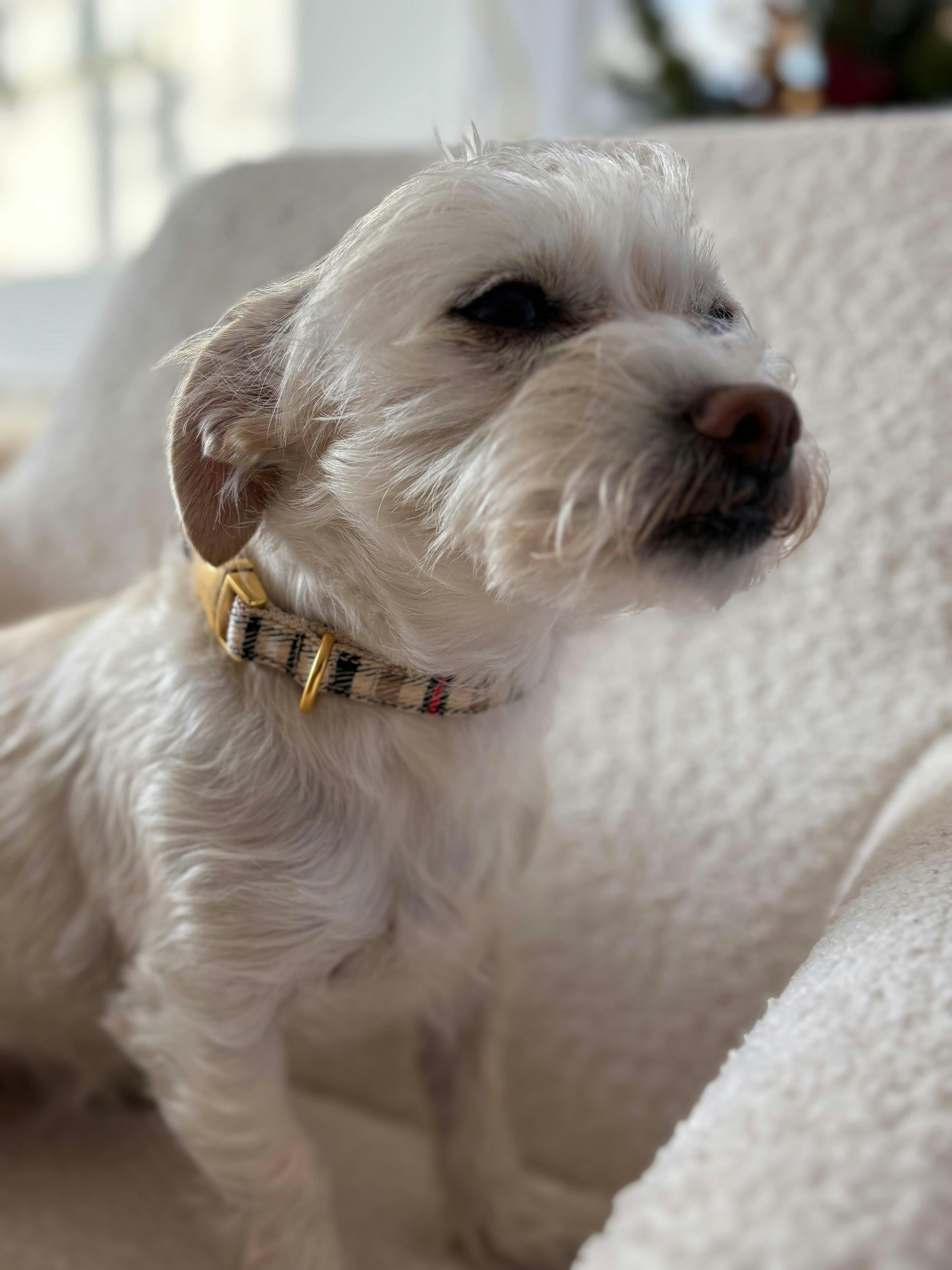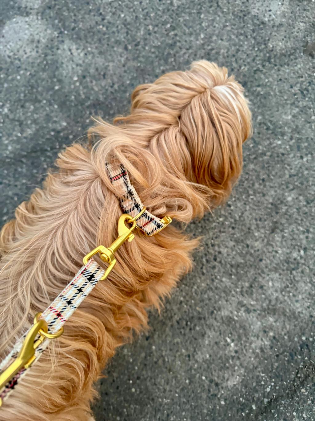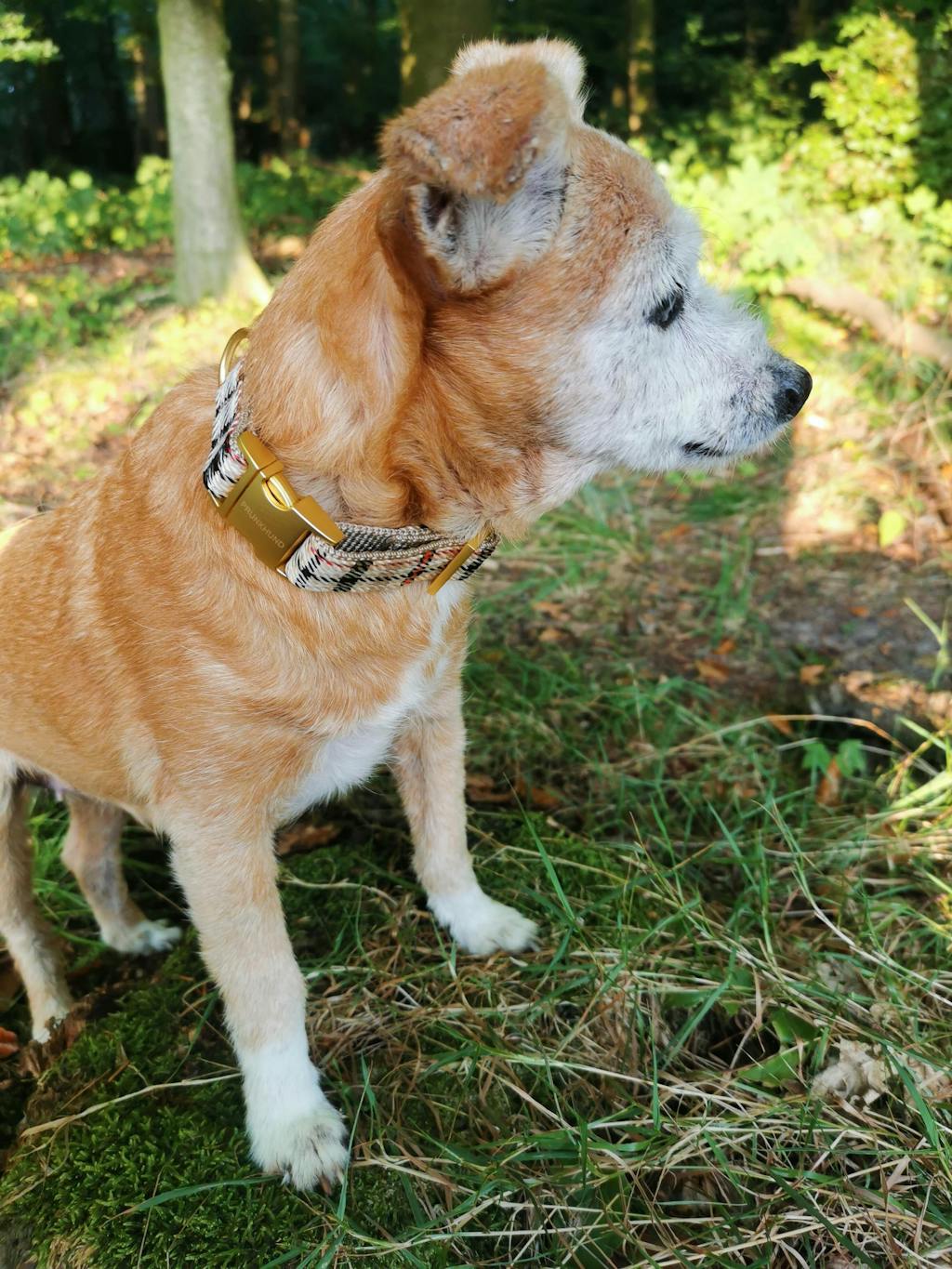 Unsere Halsbänder bestehen aus sorgfältig ausgewählten Stoffen oder Bändern, die wir auf robustes Gurtband nähen – für Stabilität und Stil. Sie sind bewusst nicht gepolstert und somit stufenlos verstellbar für die perfekte Passform. Die strapazierfähigen Metallteile entwickeln mit der Zeit eine schöne Patina – ein Zeichen vieler gemeinsamer Abenteuer.