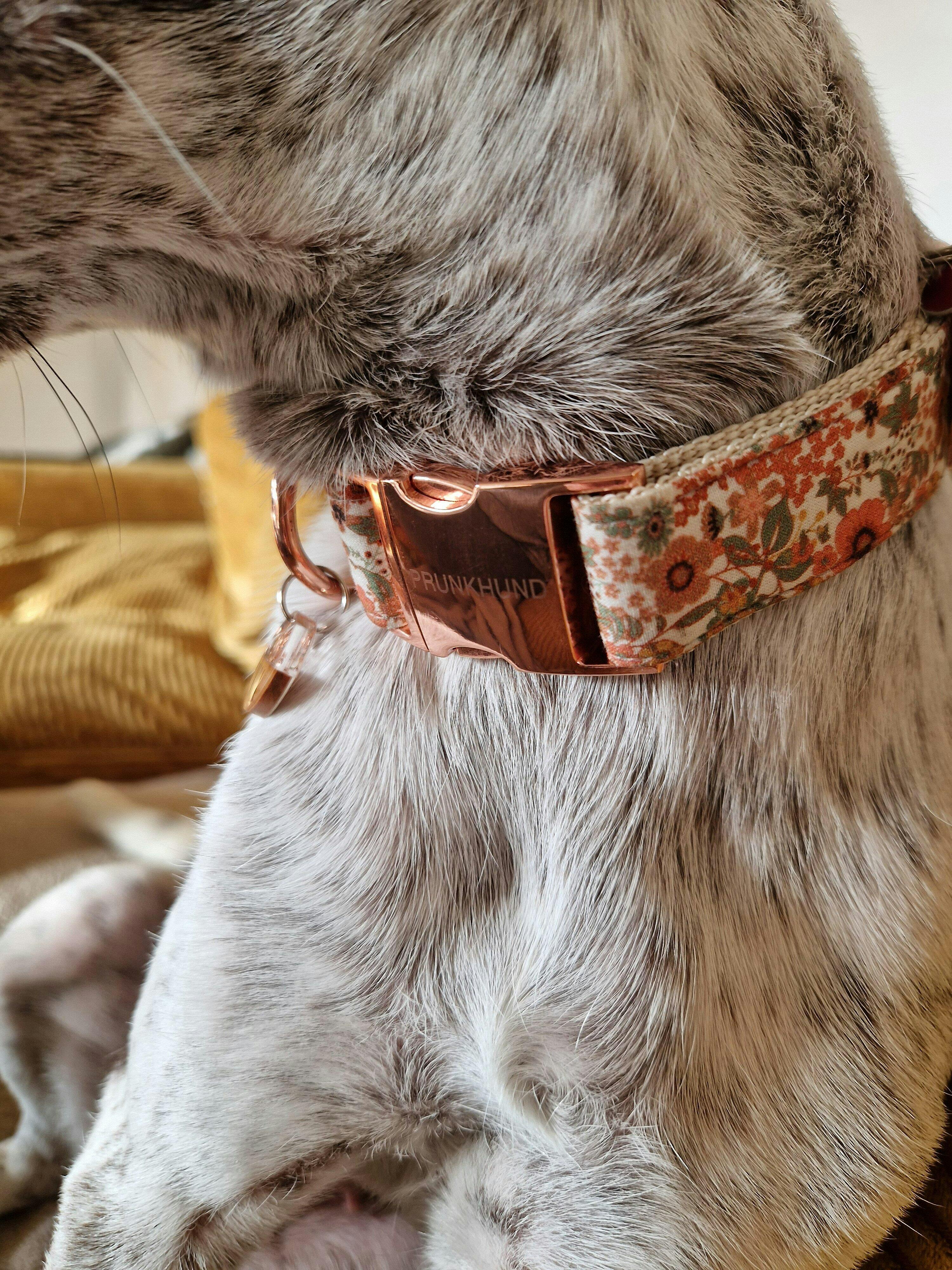 Unsere Halsbänder bestehen aus sorgfältig ausgewählten Stoffen oder Bändern, die wir auf robustes Gurtband nähen – für Stabilität und Stil. Sie sind bewusst nicht gepolstert und somit stufenlos verstellbar für die perfekte Passform. Die strapazierfähigen Metallteile entwickeln mit der Zeit eine schöne Patina – ein Zeichen vieler gemeinsamer Abenteuer.