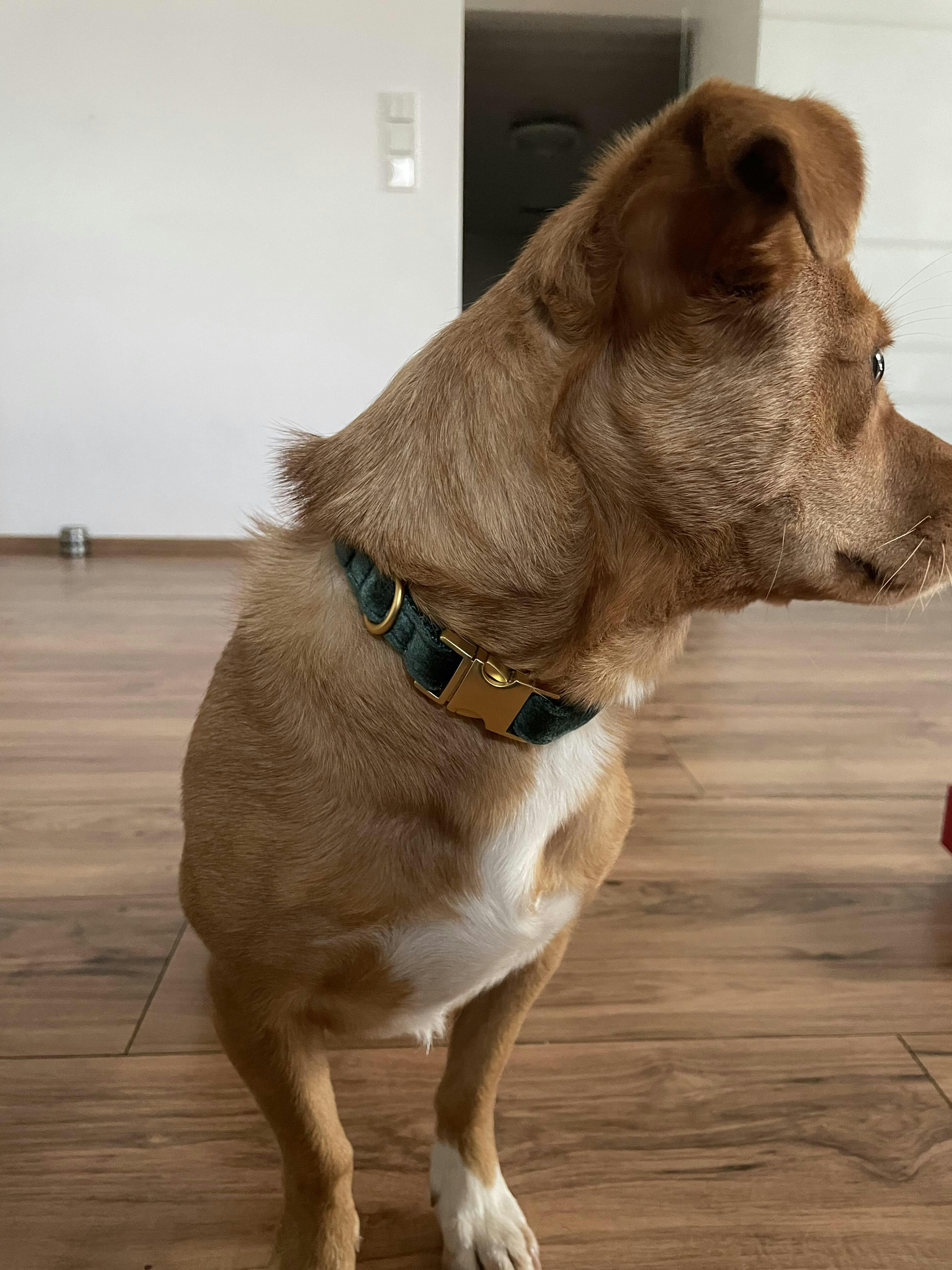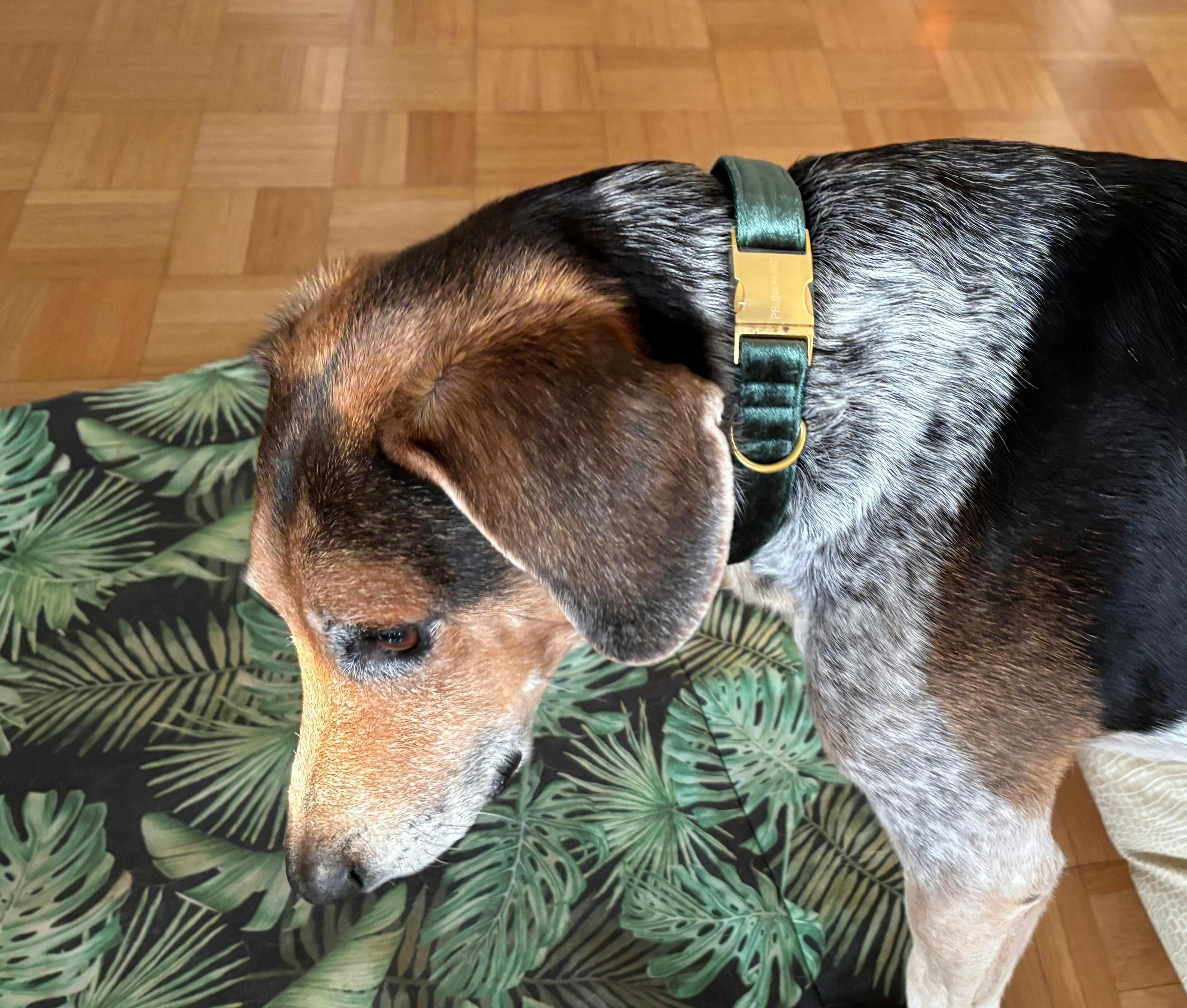 Unsere Halsbänder bestehen aus sorgfältig ausgewählten Stoffen oder Bändern, die wir auf robustes Gurtband nähen – für Stabilität und Stil. Sie sind bewusst nicht gepolstert und somit stufenlos verstellbar für die perfekte Passform. Die strapazierfähigen Metallteile entwickeln mit der Zeit eine schöne Patina – ein Zeichen vieler gemeinsamer Abenteuer.