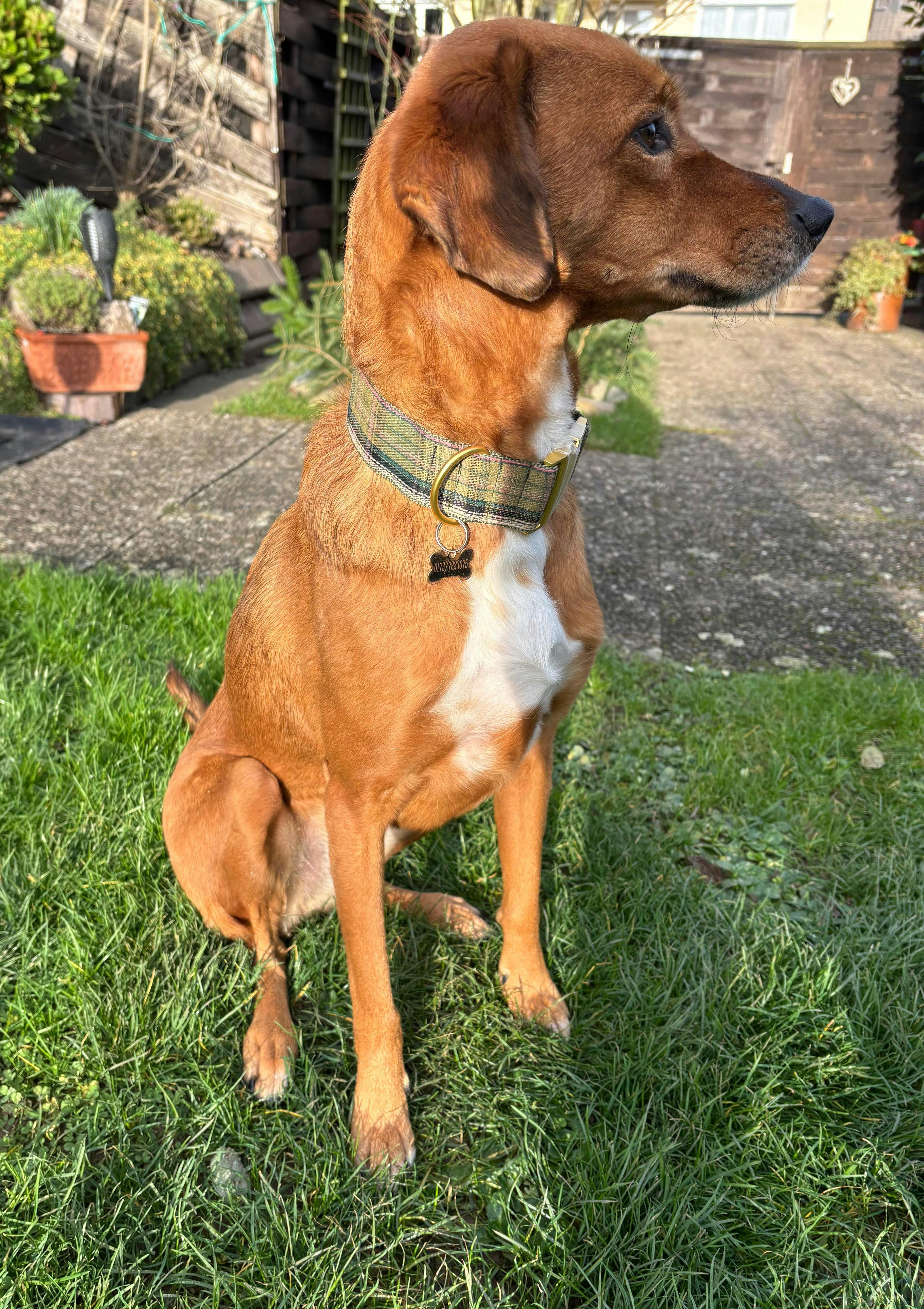 Unsere Halsbänder bestehen aus sorgfältig ausgewählten Stoffen oder Bändern, die wir auf robustes Gurtband nähen – für Stabilität und Stil. Sie sind bewusst nicht gepolstert und somit stufenlos verstellbar für die perfekte Passform. Die strapazierfähigen Metallteile entwickeln mit der Zeit eine schöne Patina – ein Zeichen vieler gemeinsamer Abenteuer.