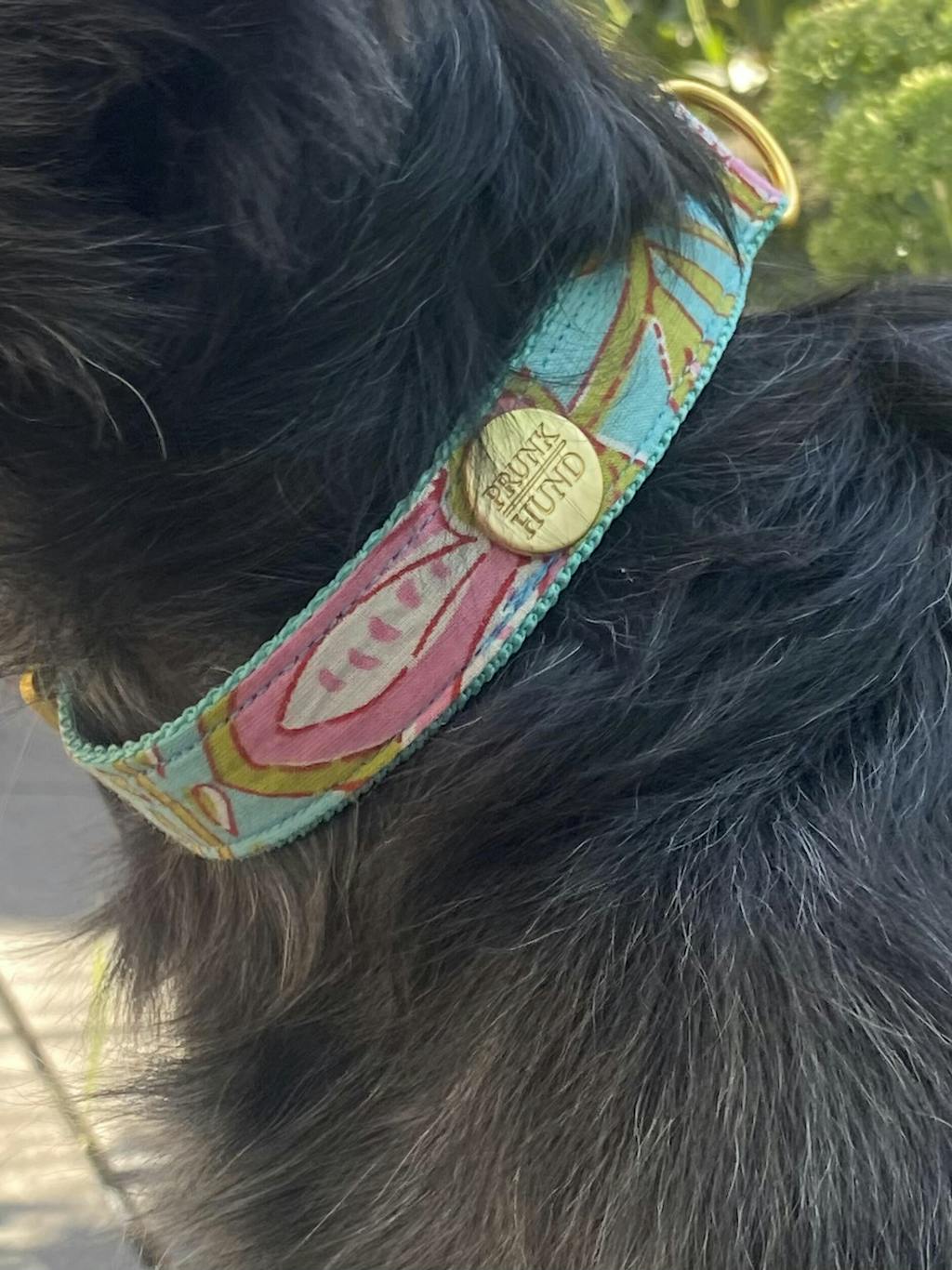 Unsere Halsbänder bestehen aus sorgfältig ausgewählten Stoffen oder Bändern, die wir auf robustes Gurtband nähen – für Stabilität und Stil. Sie sind bewusst nicht gepolstert und somit stufenlos verstellbar für die perfekte Passform. Die strapazierfähigen Metallteile entwickeln mit der Zeit eine schöne Patina – ein Zeichen vieler gemeinsamer Abenteuer.