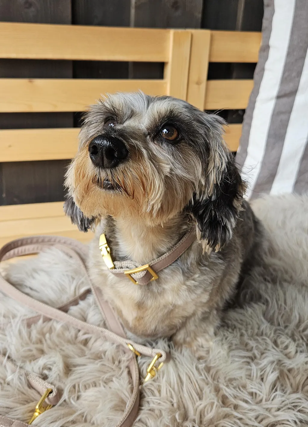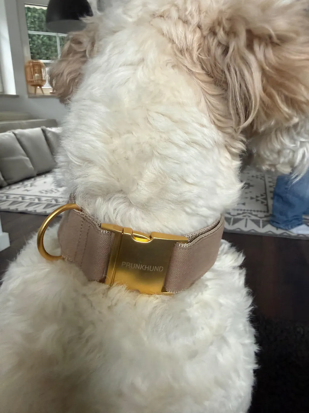 Klassisches Hundehalsband aus wasserabweisendem Baumwollstoff in hellem braun auf stabilem Gurtband - ein perfekter Begleiter für alle Jahreszeiten!