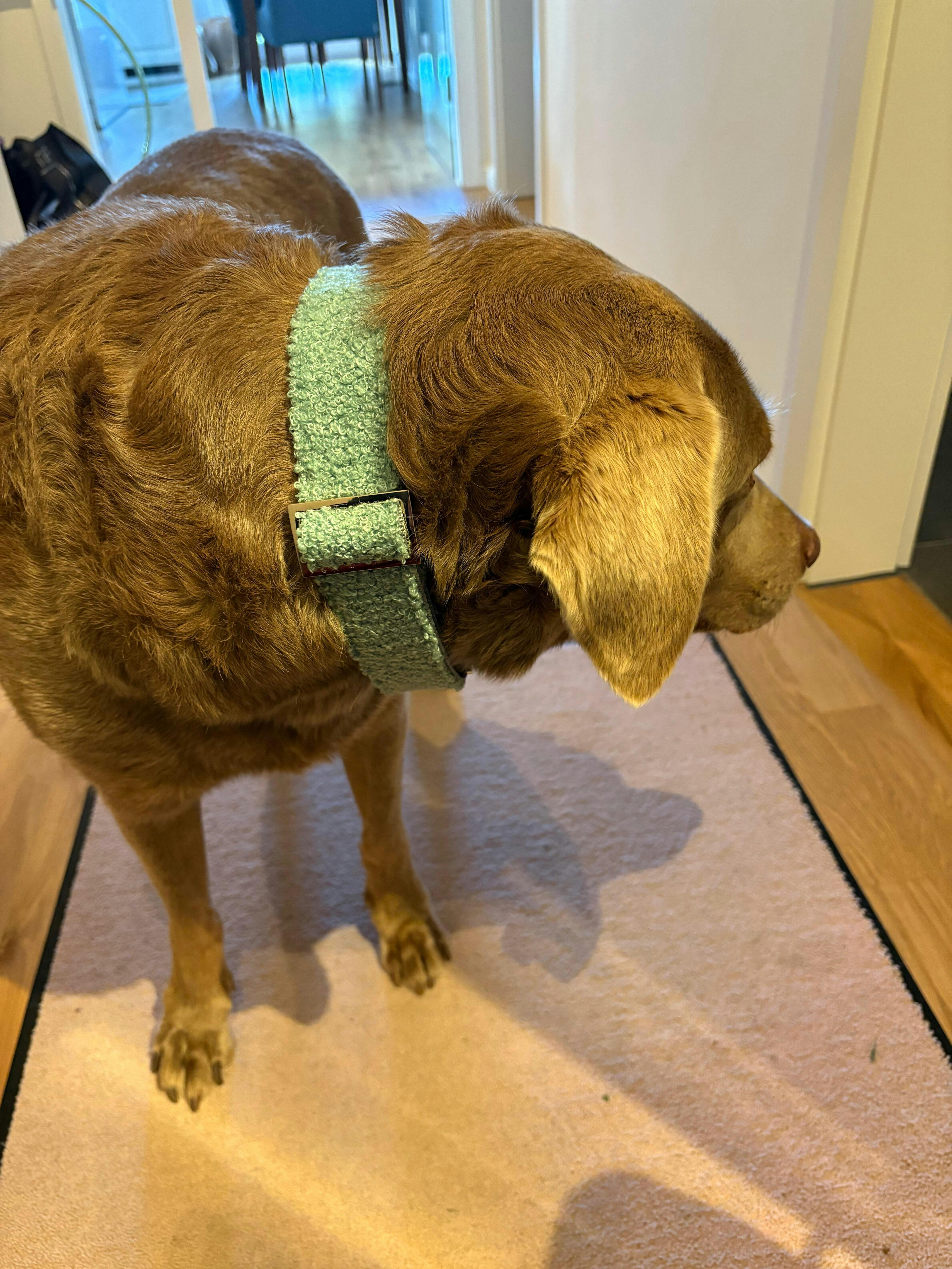 Das TEDDY Halsband ist das perfekte Modell für Herbst und Winter mit deinem Hund. Es wird von uns aus Bouclé mit silberfarbenen Metallteilen in München handgefertigt.
