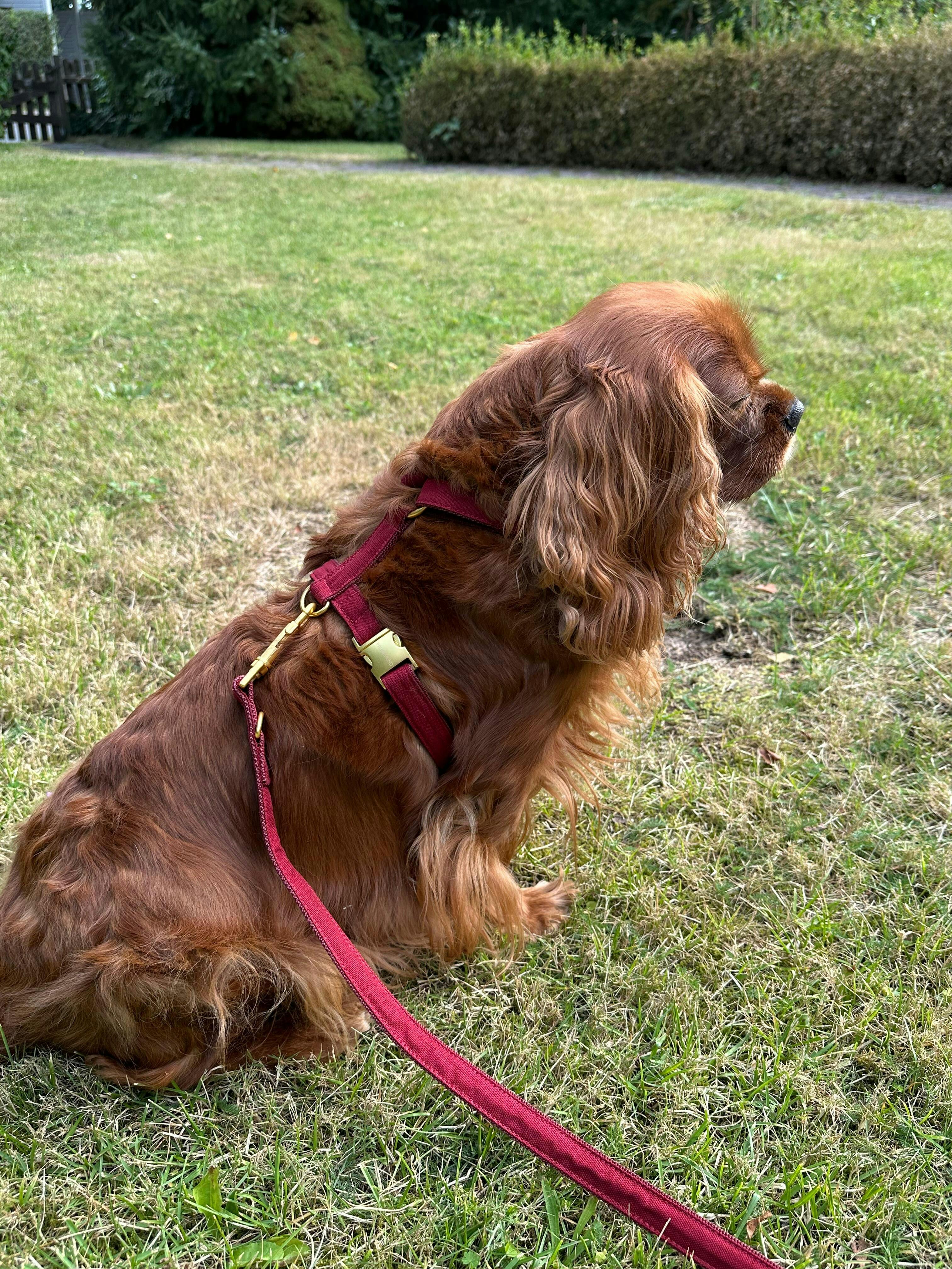 Stylisches Hundegeschirr aus wasserabweisendem Baumwollstoff in weinrot - ein perfekter Begleiter für alle Jahreszeiten!