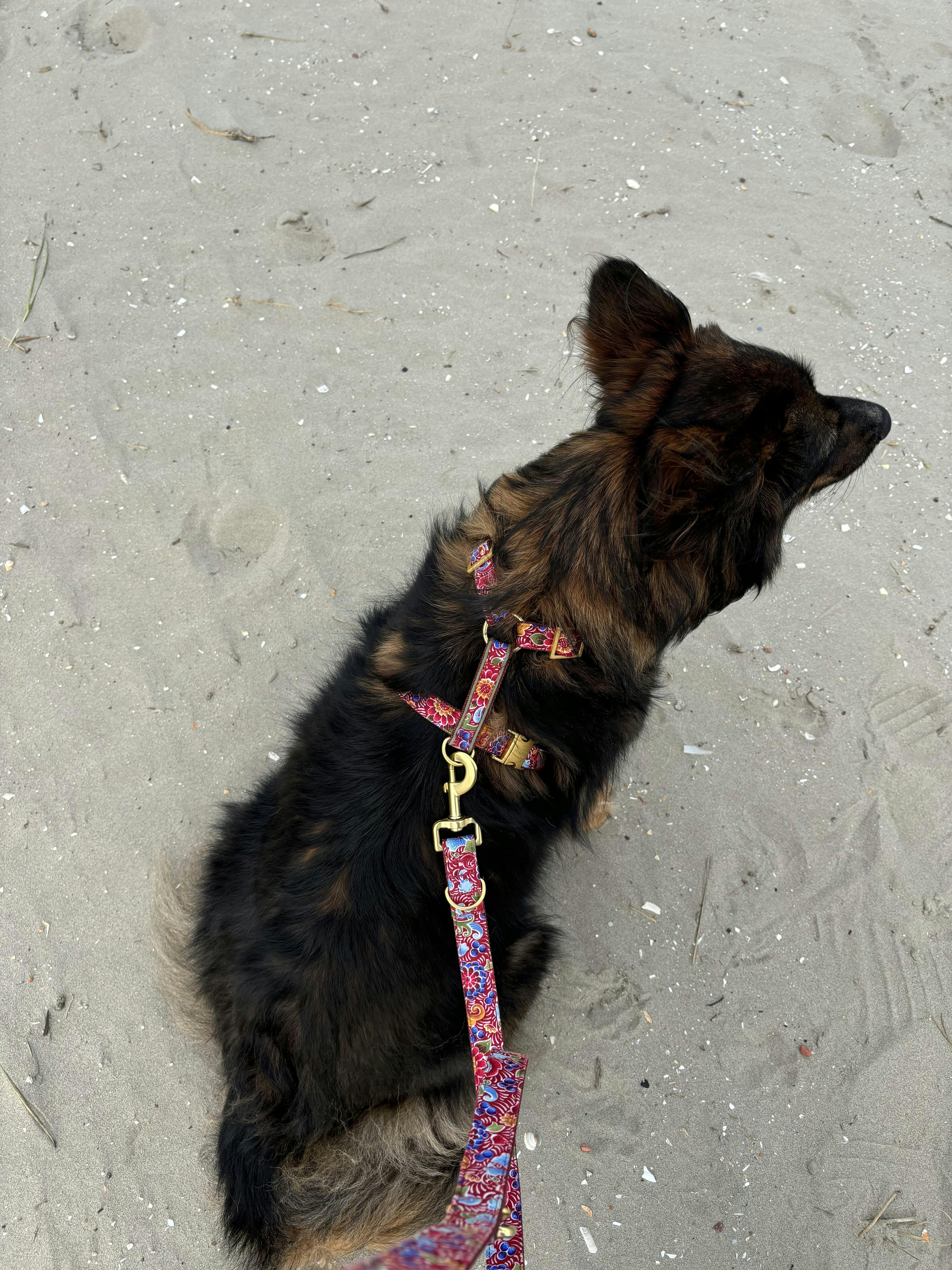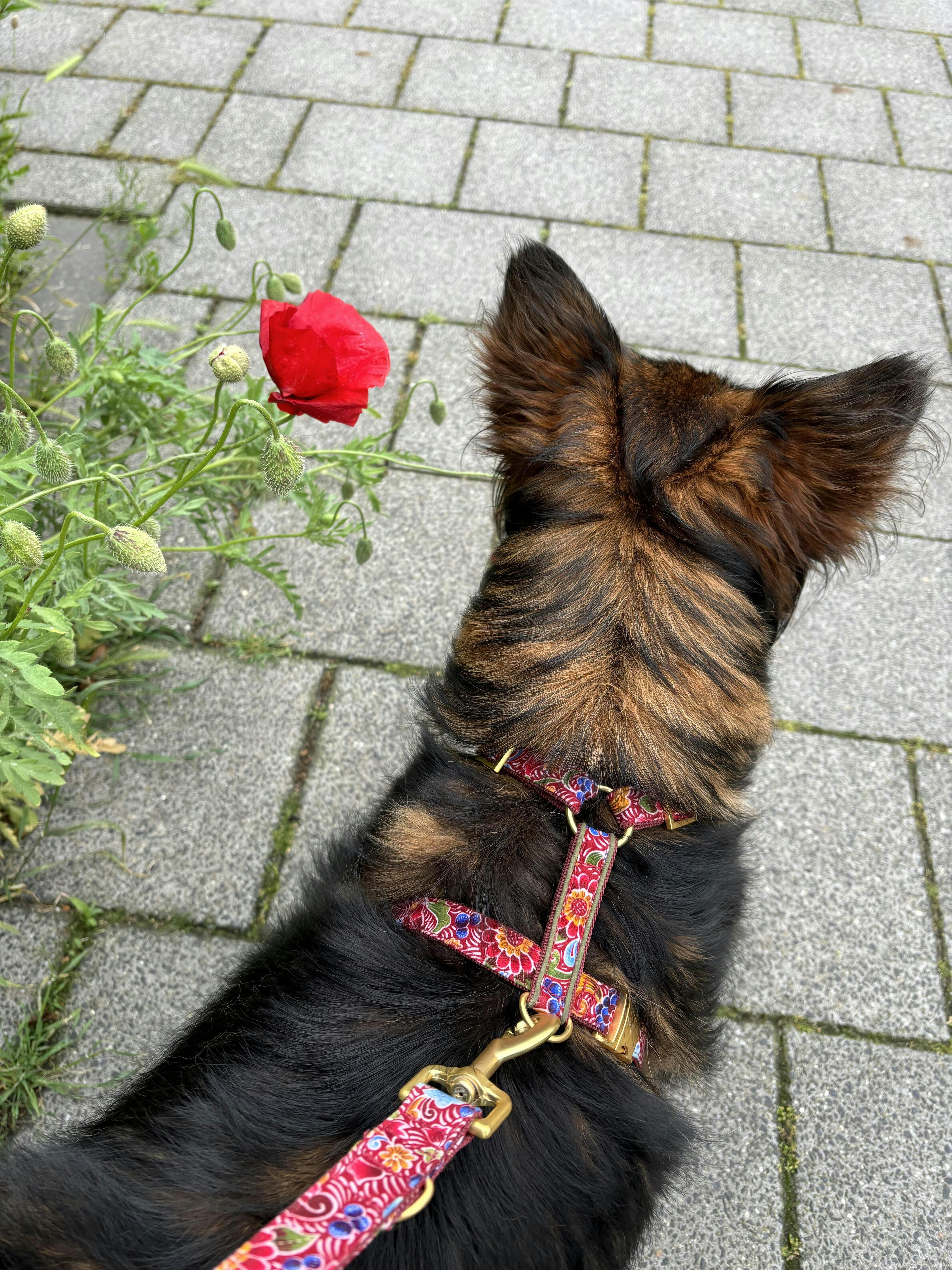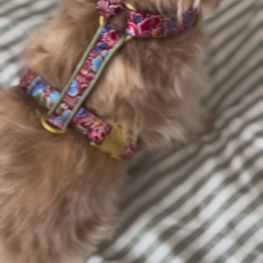 Das BOHEME Geschirr ist ein stilvolles Accessoire für deinen Hund. Es wird von uns aus dunkelrotem Stoff mit Blumenmuster mit matten, goldfarbenen Metallteilen in München handgefertigt. Eine olivgrüne Paspel verziert den Rückensteg.