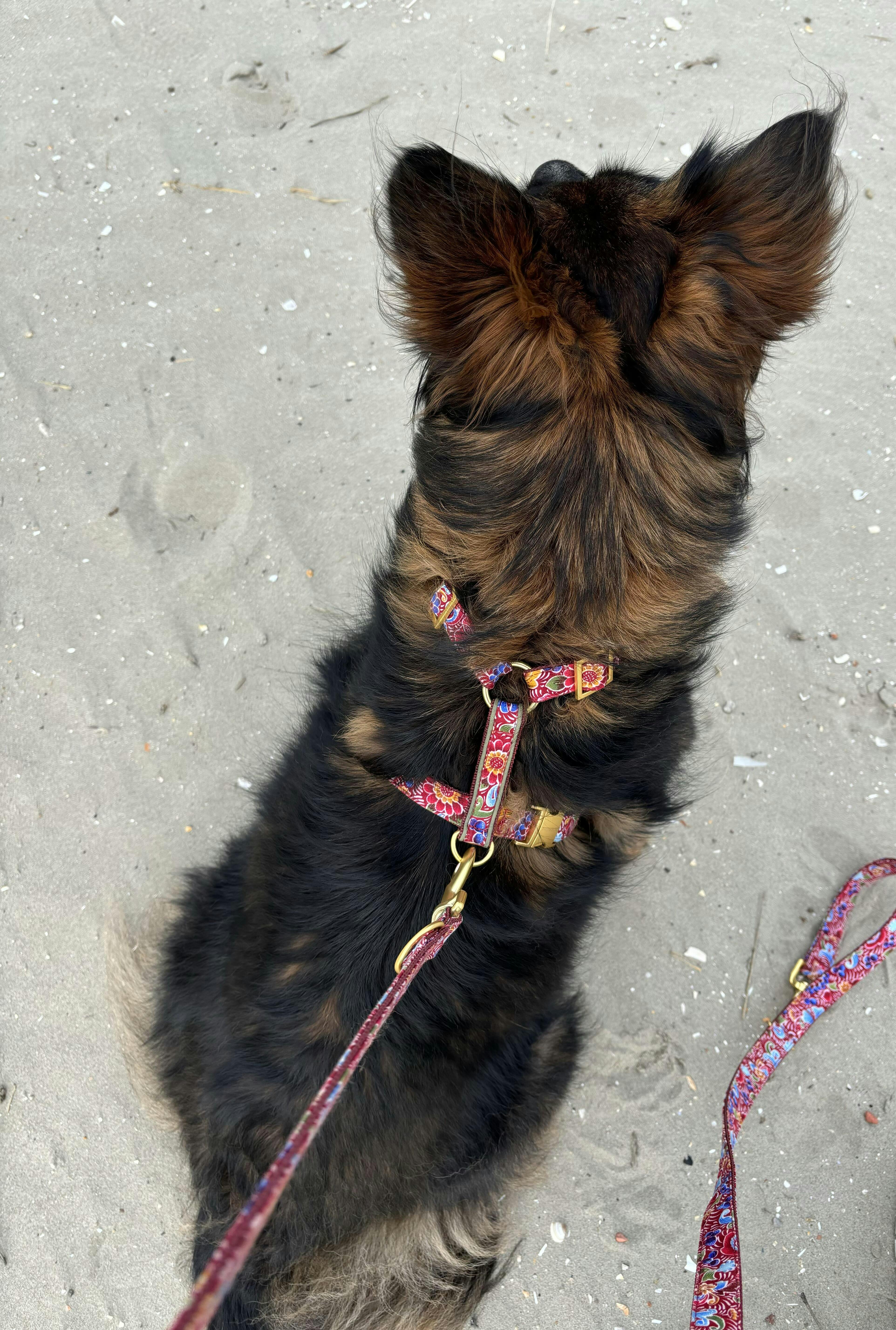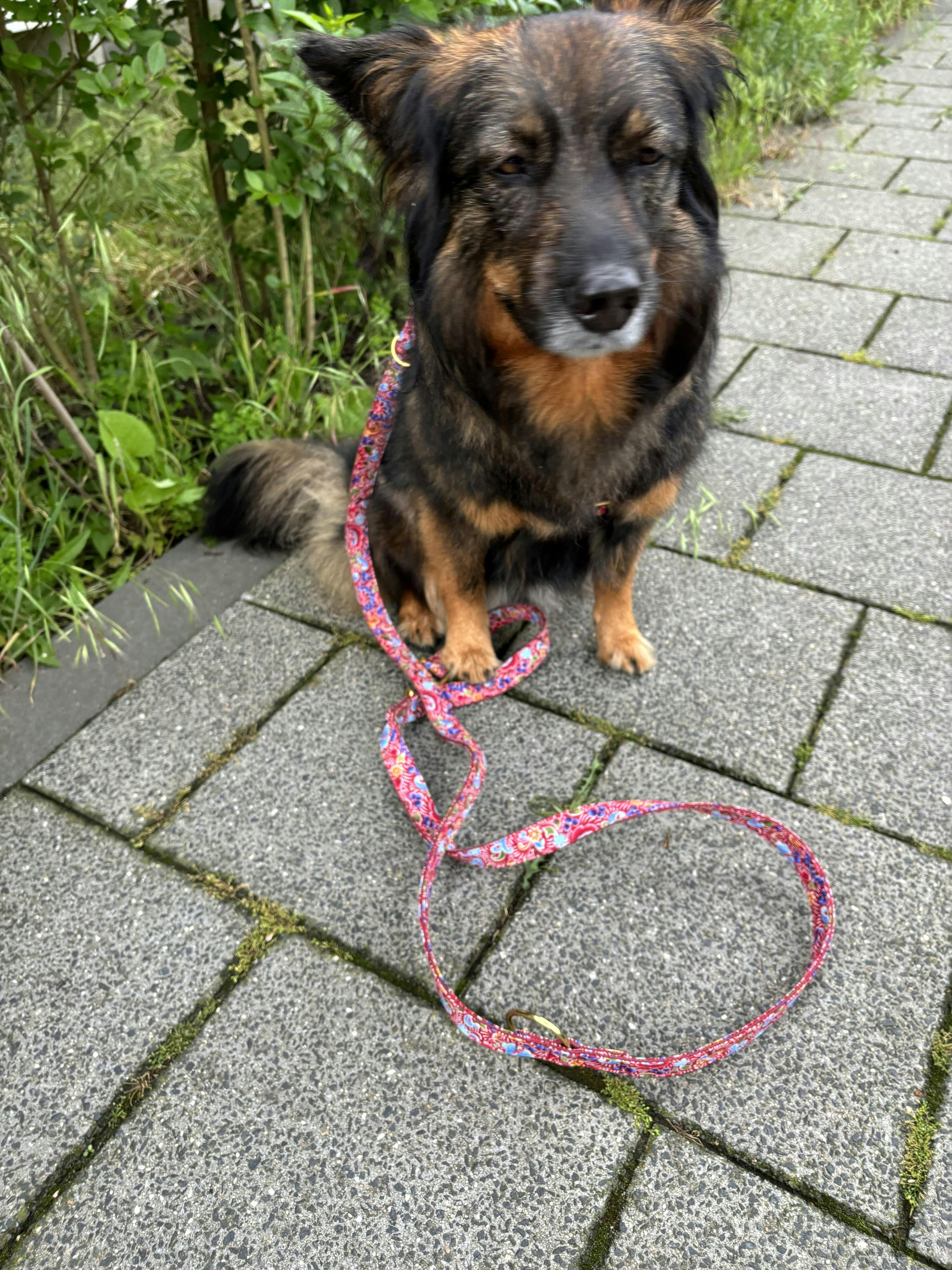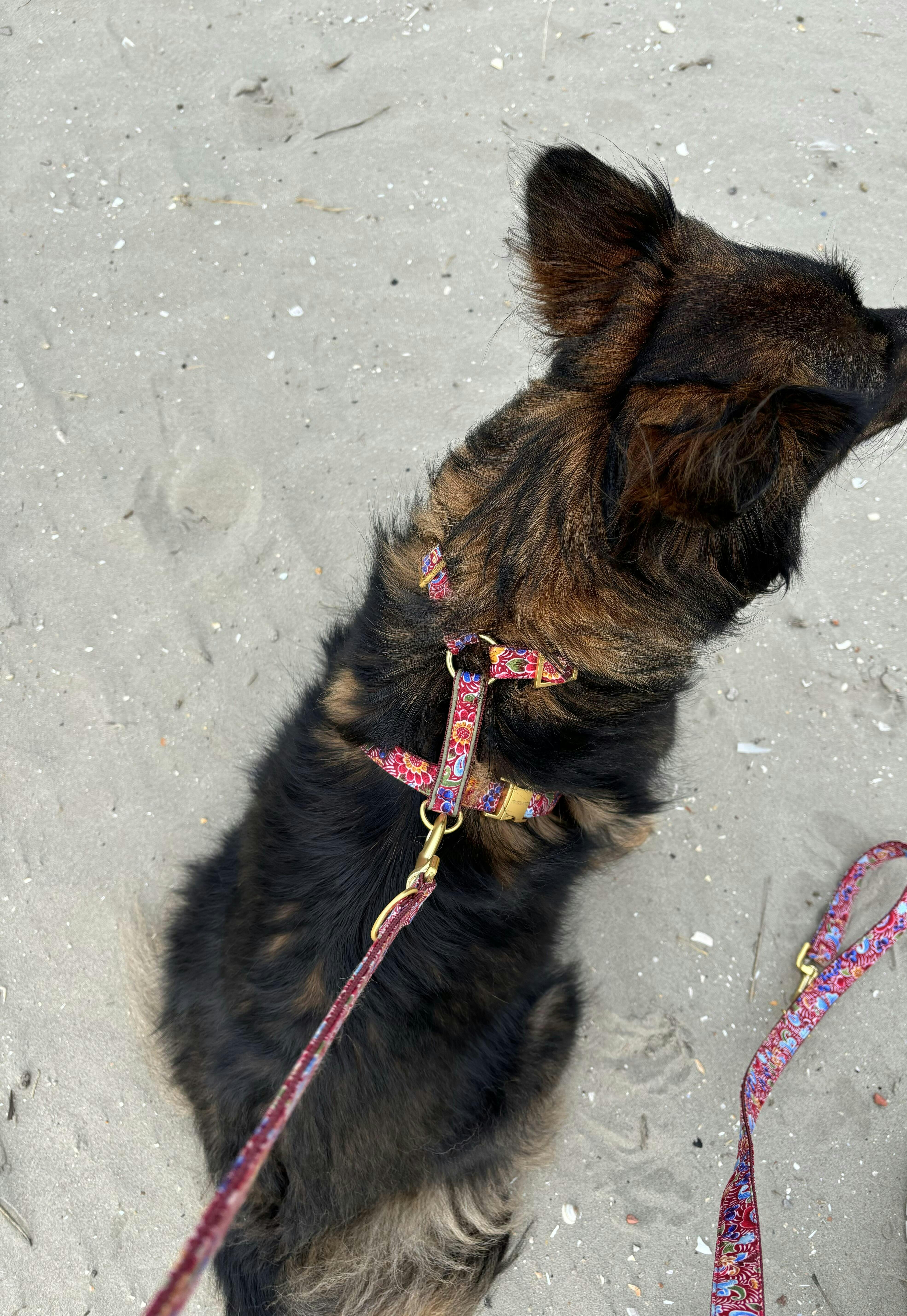 Das BOHEME Geschirr ist ein stilvolles Accessoire für deinen Hund. Es wird von uns aus dunkelrotem Stoff mit Blumenmuster mit matten, goldfarbenen Metallteilen in München handgefertigt. Eine olivgrüne Paspel verziert den Rückensteg.