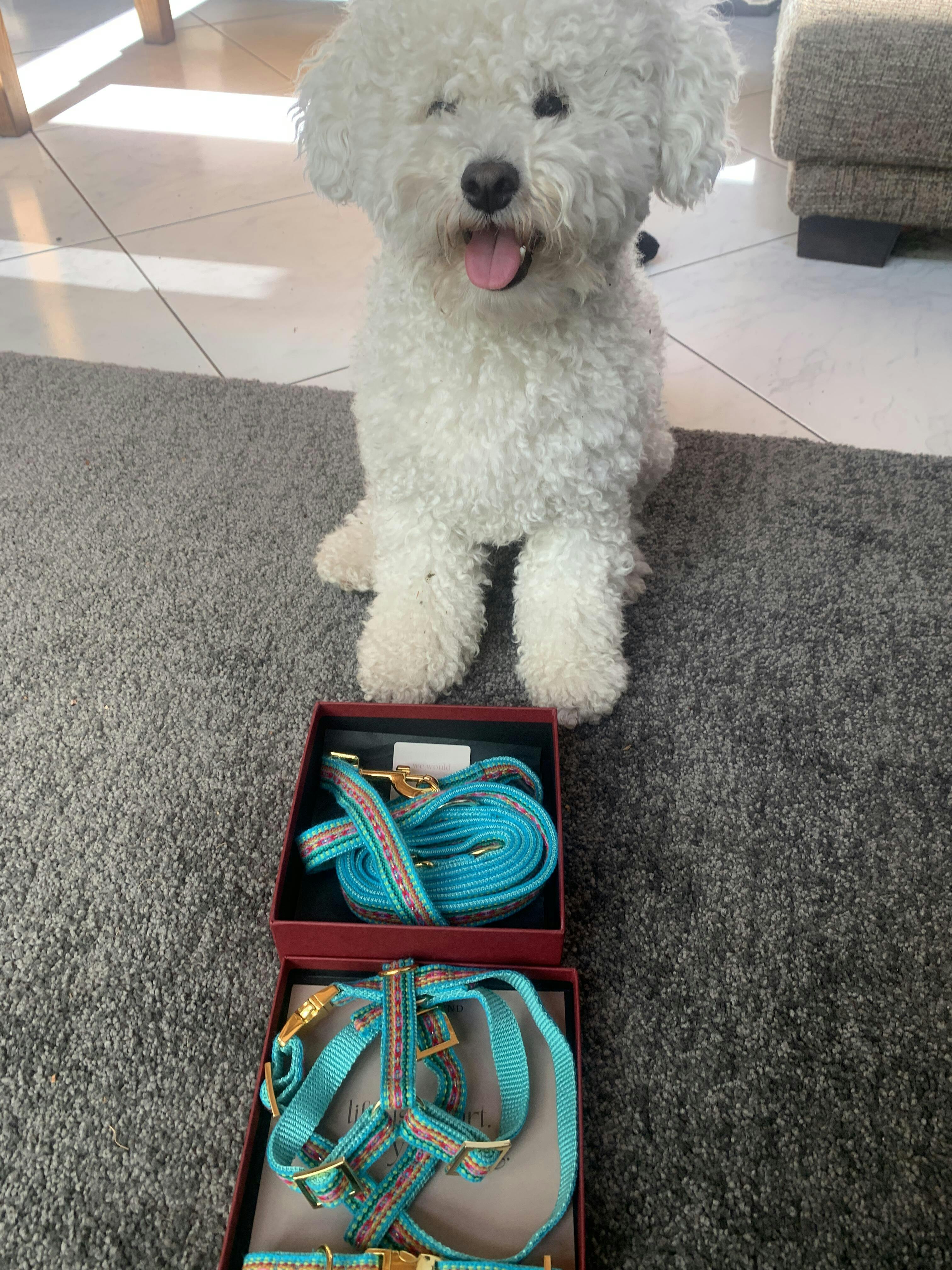 So eine wunderbar farblich abgestimmtes Geschirr, auf dem weissen Fell von Torre ein echter Hingucker. Mit den matt goldenen Schnallen wird das Geschirr perfekt. Sitzt passt und hat Luft