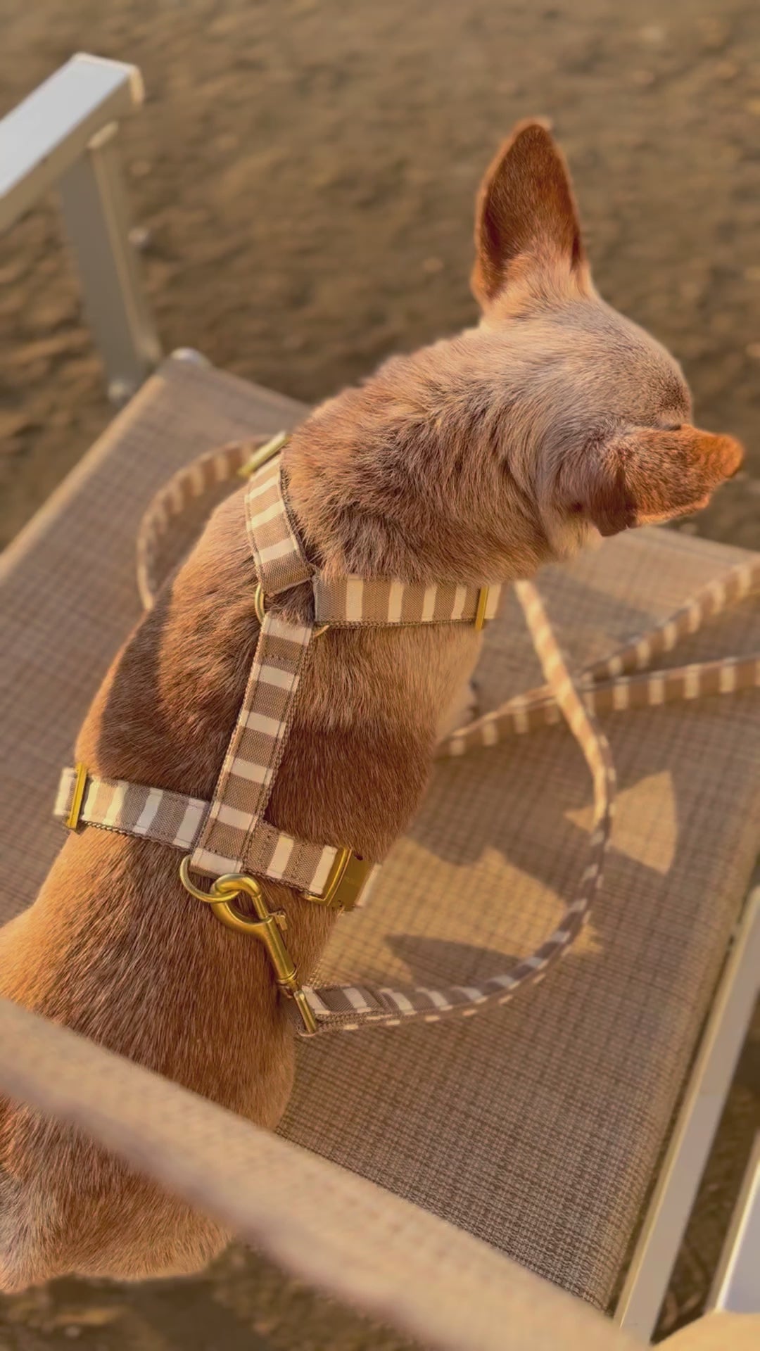 Das LIDO SAND Geschirr ist ein stilvolles Accessoire für deinen Hund. Es wird von uns aus Streifenstoff mit matten, goldfarbenen Metallteilen in München handgefertigt.