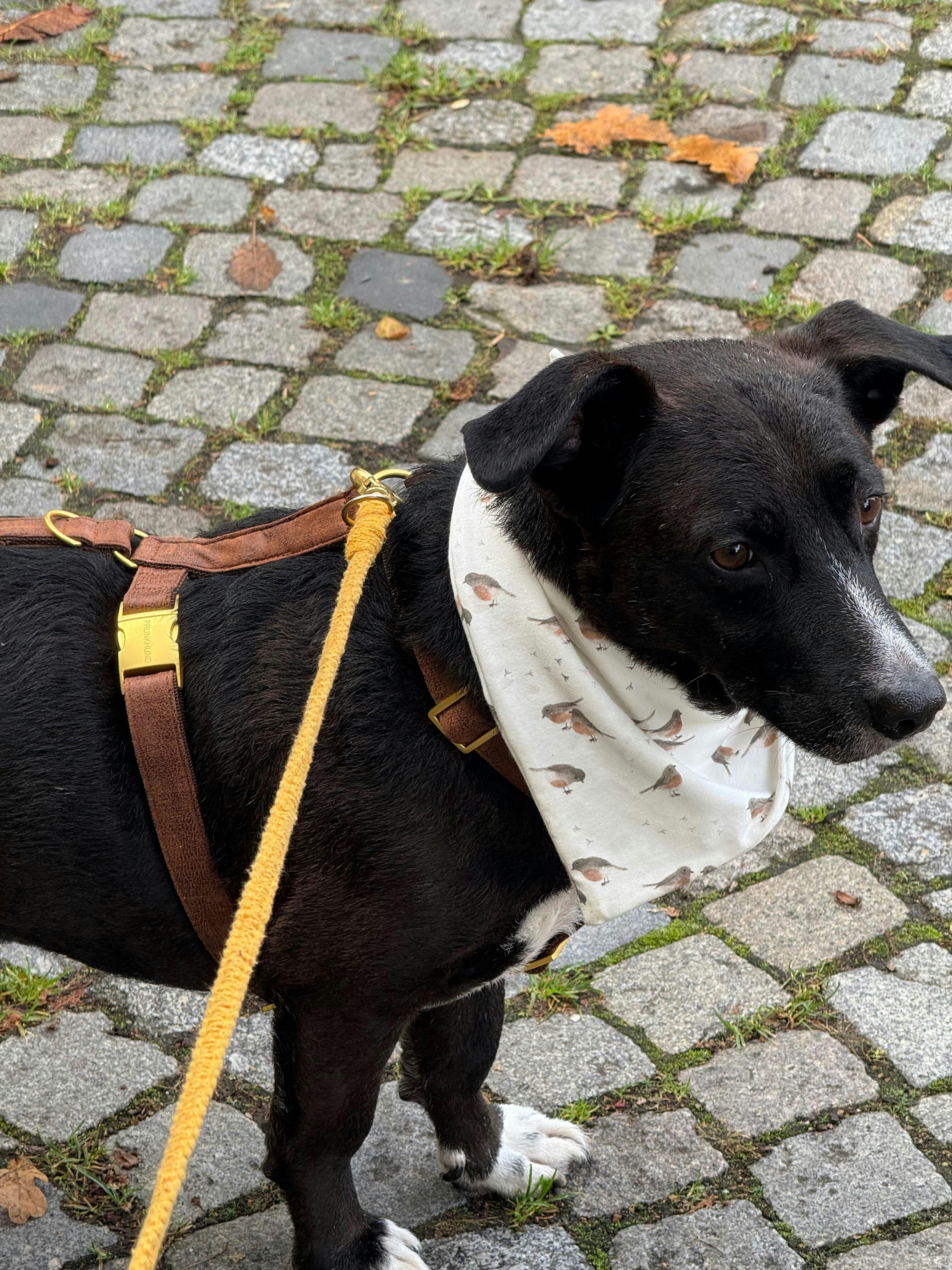 Mit Sorgfalt und Liebe zum Detail fertigen wir dieses Geschirr in unserer Manufaktur für deinen Prunkhund, damit es euch auf viele gemeinsame Abteuer begleitet.