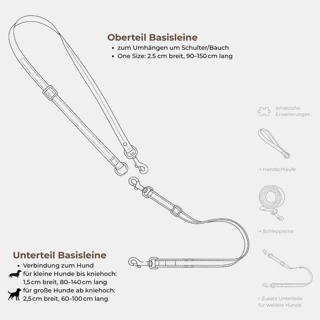 Ob kurz oder lang, über die Schulter, um den Bauch, großer oder kleiner Hund oder sogar ein ganzes Rudel - unsere erweiterbares ESSENTIAL Leinensystem ist der perfekte Begleiter für jeden Tag.