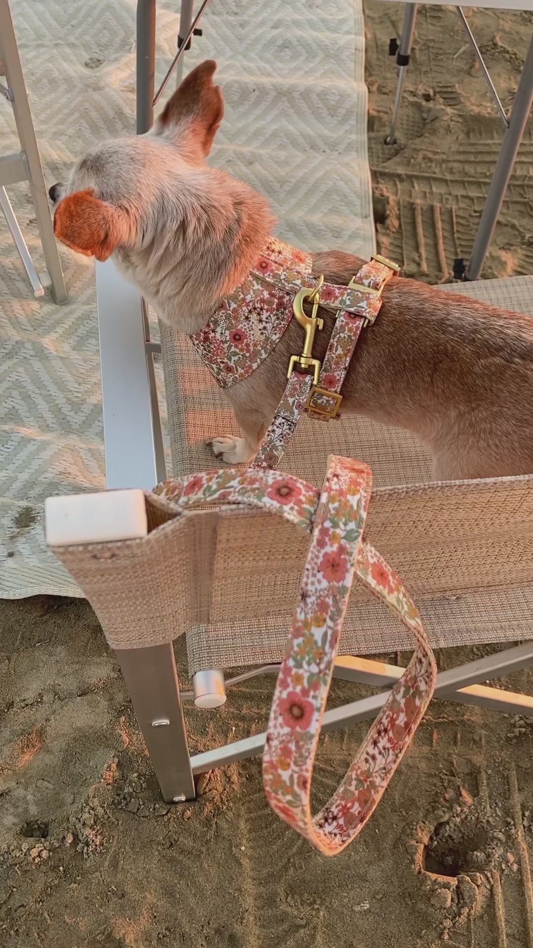 Das FIORE Softgeschirr ist ein stilvolles Accessoire für deinen Hund. Es wird von uns aus Blümchenstoff mit matten, goldfarbenen Metallteilen in München handgefertigt.