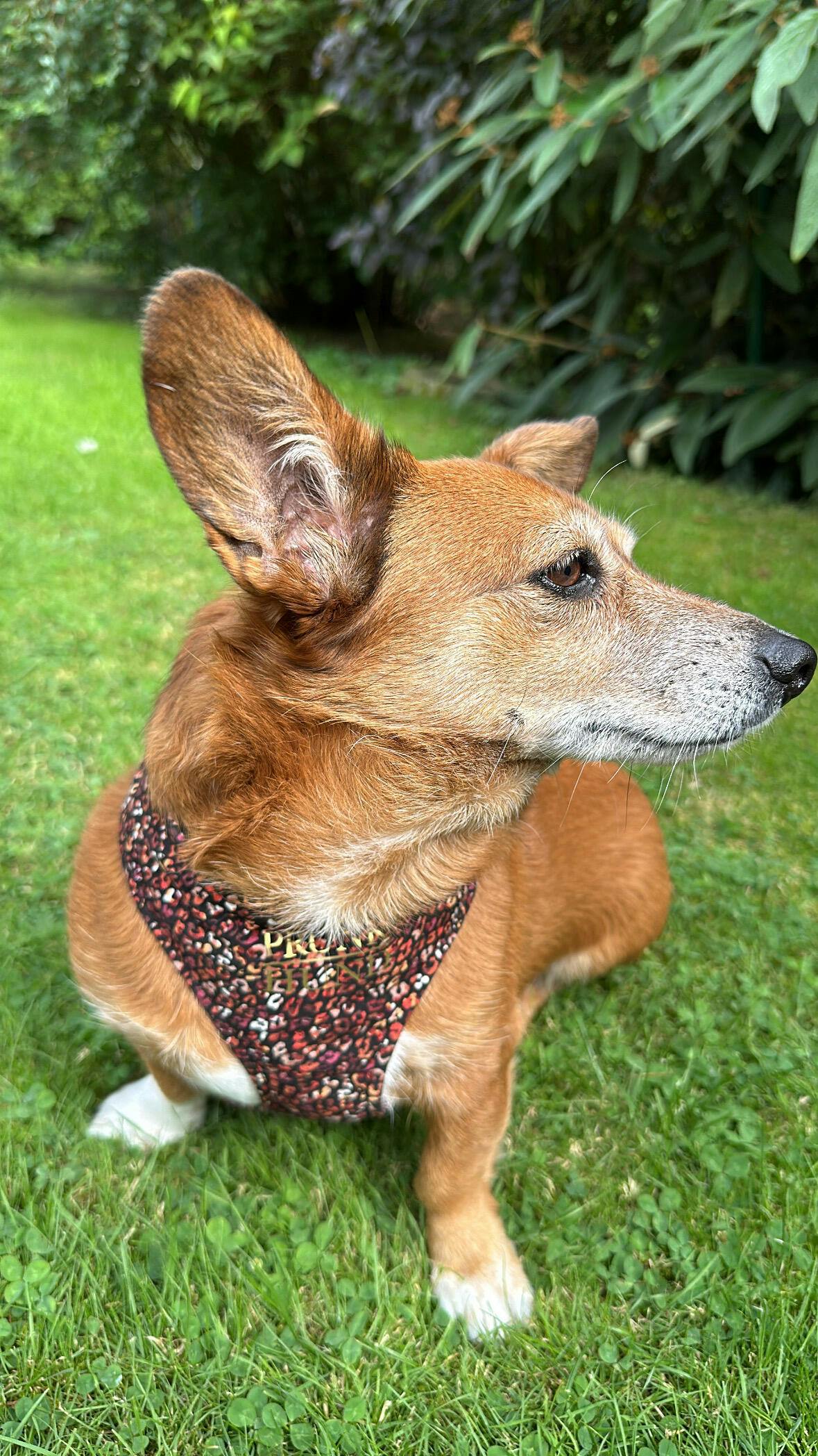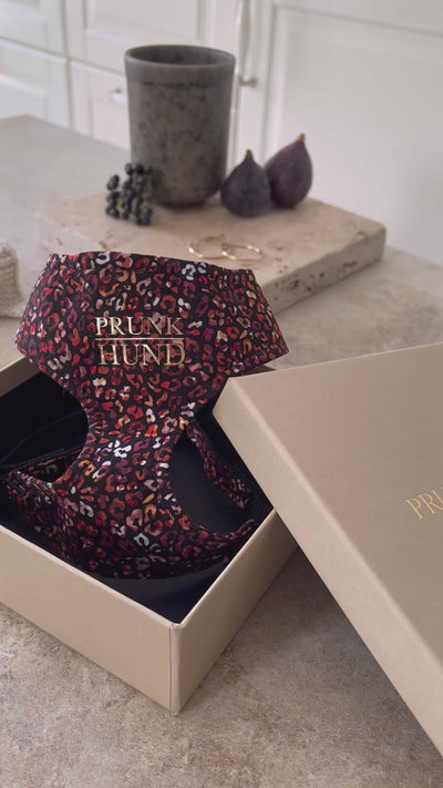 Stylisches Hundegeschirr aus Baumwoll-Stoff in modernem Muster in leuchtenden Rot- und Orange-Tönen mit schwarzer Metall Schließe. Wir fertigen dieses Hundegeschirr in sorgfältiger Handarbeit in München an.