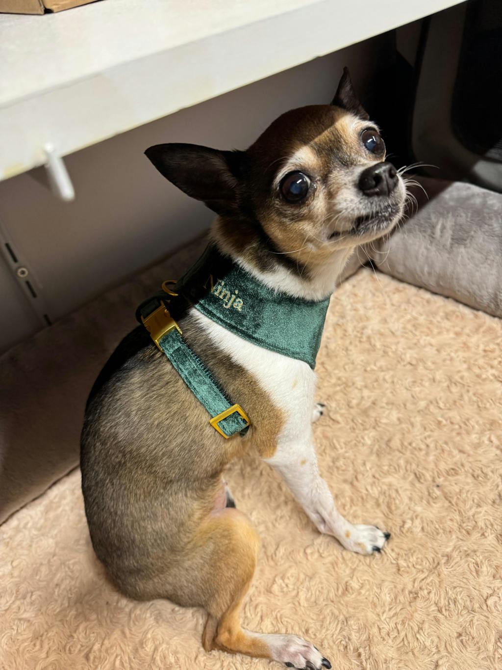 Das PINE Softgeschirr ist ein stilvolles Accessoire für deinen Hund. Es wird von uns aus tannengrünem Samtstoff mit matten, goldfarbenen Metallteilen in München handgefertigt.