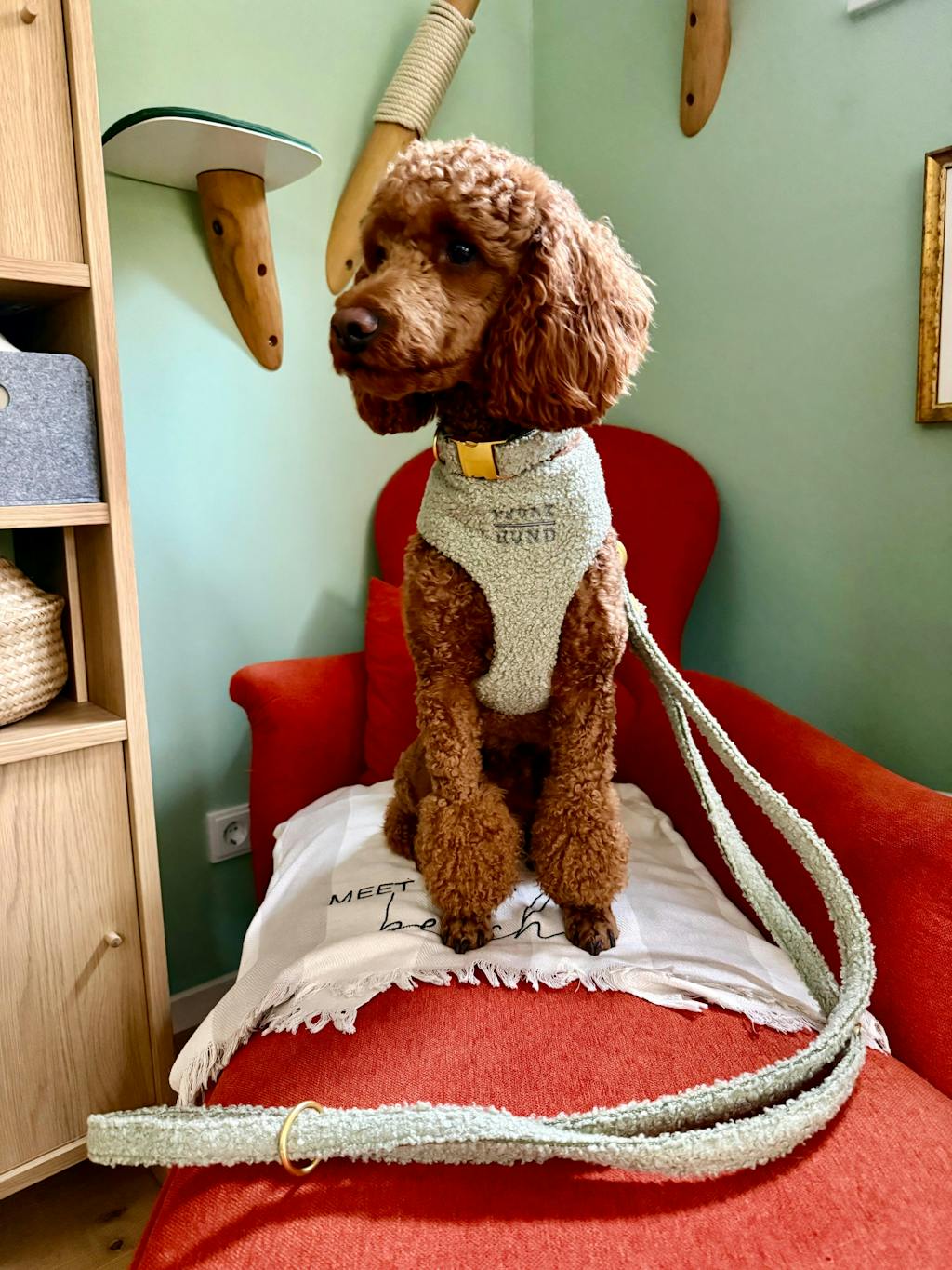 Das TEDDY Hundegeschirr ist das perfekte Modell für Herbst und Winter mit deinem Hund. Es wird von uns aus Bouclé und stabilem Gurtband mit matten, goldfarbenen Metallteilen in München handgefertigt.