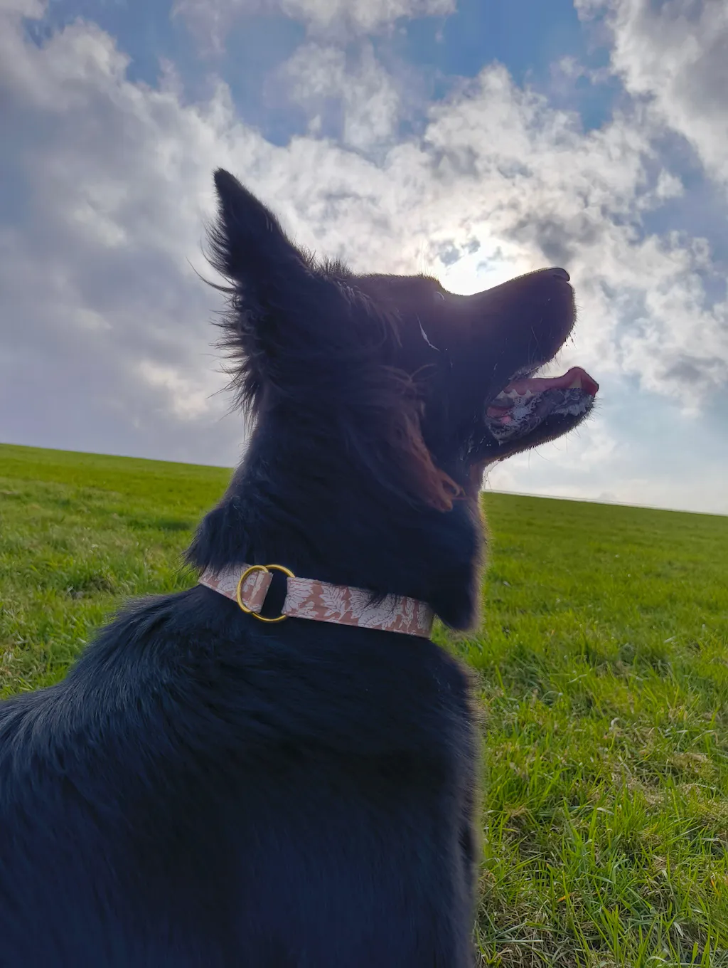 Unsere Halsbänder bestehen aus sorgfältig ausgewählten Stoffen oder Bändern, die wir auf robustes Gurtband nähen – für Stabilität und Stil. Sie sind bewusst nicht gepolstert und somit stufenlos verstellbar für die perfekte Passform. Die strapazierfähigen Metallteile entwickeln mit der Zeit eine schöne Patina – ein Zeichen vieler gemeinsamer Abenteuer.